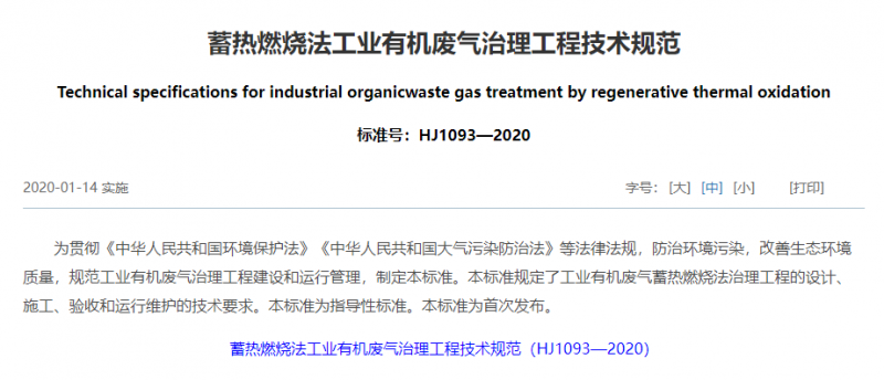 近年来,随着环保政策的不断深入展开,VOCs废气焚烧技术如蓄热燃烧法(RTO)是目前工业源VOCs治理的主流技术之一,该技术的研究开发已经日臻成熟,对低浓度、中高浓度、成分复杂的VOCs废气处理效率高,近年来在石化、化工、喷涂、包装印刷、医药等领域得到了广泛的应用。为加强RTO工程应用的技术指导,中国环境保护产业协会牵头编制《蓄热燃烧法工业有机废气治理工程技术规范》(HJ1093-2020),该规范已于2020年4月17日正式实施。