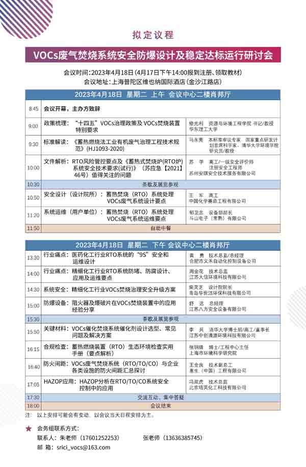本次研讨会旨在交流研讨企业VOCs焚烧系统如RTO炉系统规范设计、建设及安全运维,协助VOCs焚烧装备设计单位及使用企业科学安全建设、管理和使用VOCs焚烧系统。研讨会将邀请知名企业、环保主管单位和行业专家,通过研讨报告形式,为VOCs治理产业搭建技术设备交流接洽平台,更好地应对新环保形势下的要求。