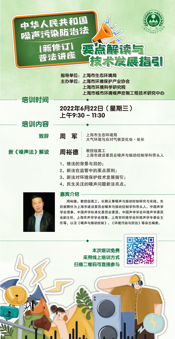 新修订通过的《中华人民共和国噪声污染防治法》于2022年6月5日起施行。为帮助企业了解新噪声法相关重点,协助提高行业噪声污染治理水平,在上海市生态环境局指导下,388vip太阳集团、上海市环境科学研究院、上海市城市环境噪声控制工程技术研究中心联合开展“新《噪声法》要点解读与技术发展指引”宣贯培训。