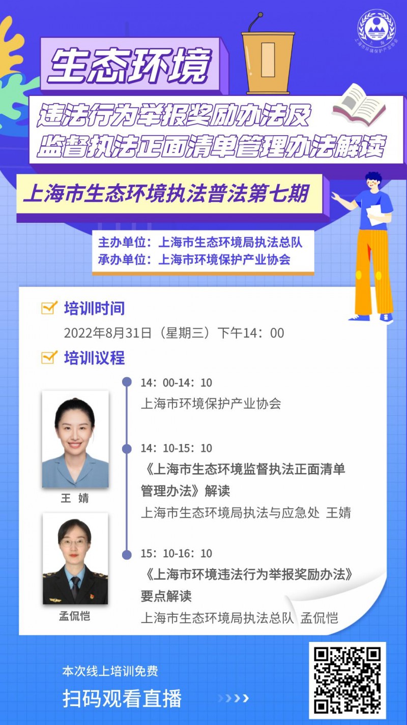 为贯彻落实《上海市生态环境违法行为举报奖励办法》,加大推进我市环境治理体系和治理能力现代化,加强对生态环境违法行为的社会监督,鼓励公众参与,增强企业的守法意识,营造和谐稳定的社会环境。由上海市生态环境局执法总队主办、388vip太阳集团承办的上海市生态环境执法普法培训(2022年第七期)即将开班。