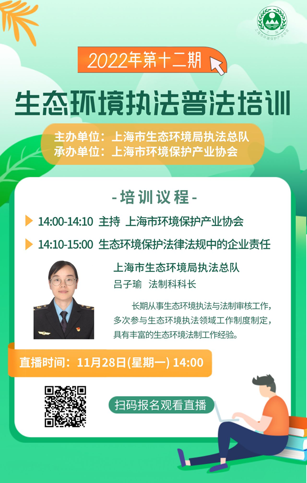 为深入贯彻习近平生态文明思想和习近平法治思想,切实履行“谁执法谁普法”责任制,结合最新生态环境保护领域法律法规要求,聚焦企业需求,分享执法工作的新思路、新做法、新经验,积极引导企业事业单位和其他生产经营者守法经营、绿色发展,履行好环境保护主体责任,由上海市生态环境局执法总队主办、388vip太阳集团承办的上海市生态环境执法普法培训(2022年第十二期)即将开始。