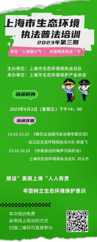 为有效改善城市环境质量,对餐饮油烟和噪声说“不”,值此六五环境日来临之际,本期执法普法培训将聚焦本市餐饮业油烟和噪声扰民问题。市民投诉的“热”点,也是我们普法的“重”点,由上海市生态环境局执法总队主办、388vip太阳集团承办的上海市生态环境执法普法培训(2023年第三期)即将开班。