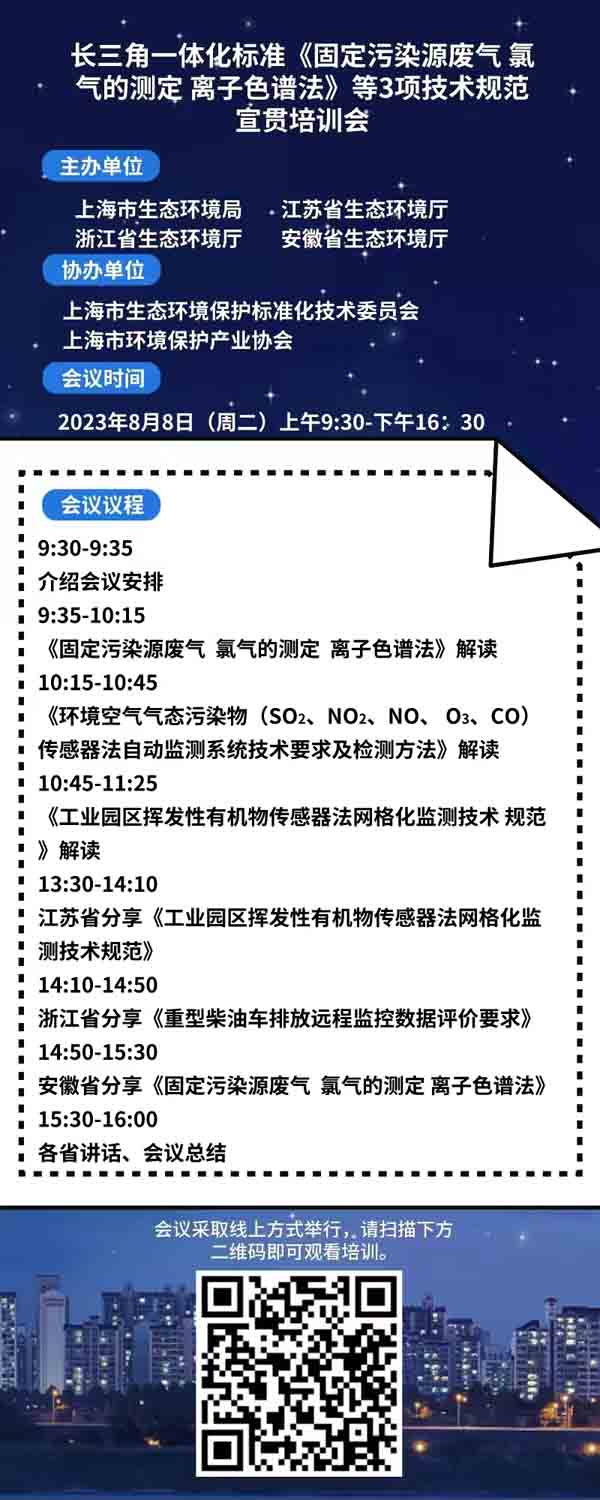 长三角一体化标准《固定污染源废气 氯气的测定 离子色谱法》《环境空气气态污染物(SO2、NO2、NO、O3、CO)传感器法自动监测系统技术要求及检测方法》《工业园区挥发性有机物传感器法网格化监测技术规范》3项已正式发布实施。为进一步加强宣贯,更好地实施好标准,经三省一市生态环境部门共同商议,定于2023年8月8日(周二)上午9:30举行宣贯培训会,会期一天。届时,将邀请3个标准的主编单位负责人作详细解读,并邀请江浙皖三省专家作长三角标准的进一步讲解或解读。现就相关事项通知如下: