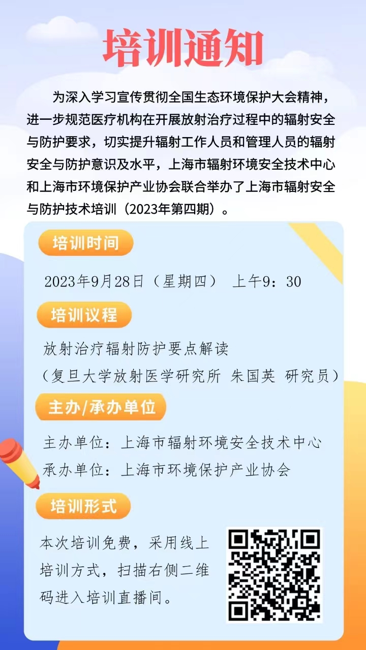 为深入学习宣传贯彻全国生态环境保护大会精神,进一步规范医疗机构在开展放射治疗过程中的辐射安全与防护要求,切实提升辐射工作人员和管理人员的辐射安全与防护意识及水平,由上海市辐射环境安全技术中心主办、388vip太阳集团承办的上海市辐射安全与防护技术培训(2023年第四期),即将开始。