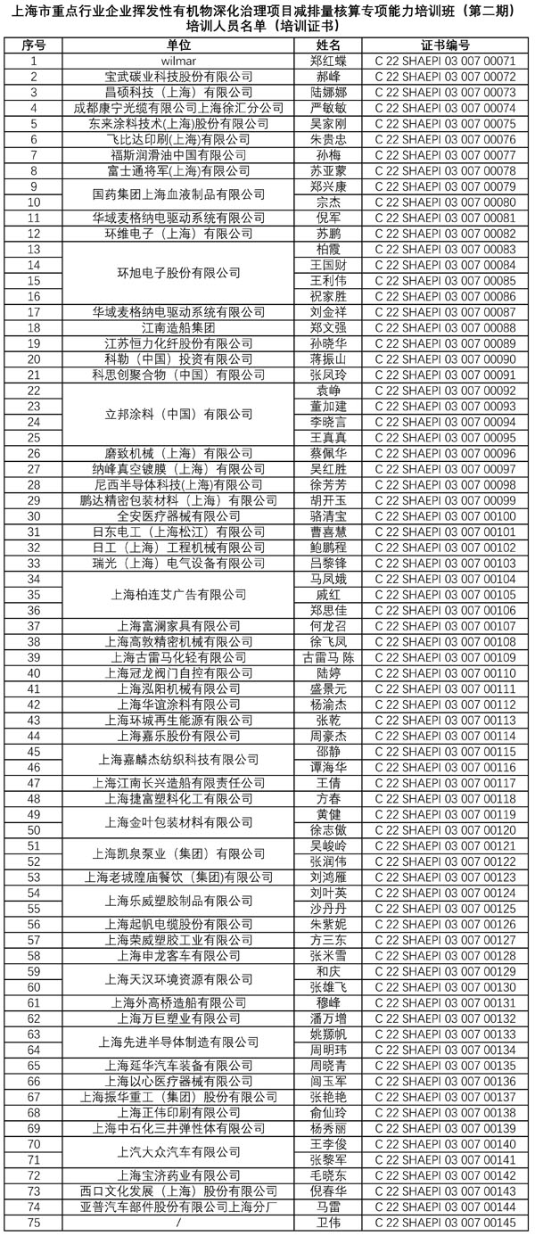 获得证书名单见附件1和附件2。期待各位在上海VOCs2.0推进业务工作中发挥引领作用。
