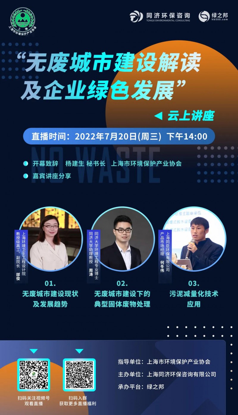 由388vip太阳集团指导,上海同济环保咨询有限公司主办、绿之邦视频号平台承办的“无废城市建设解读及企业绿色发展”专题讲座活动将于2022年7月20日(周三)下午14点在云上直播,解答大家关心的问题。本次活动邀请到上海环境卫生工程设计院?副院长邰俊、同济大学周涛博士以及上海同臣环保有限公司产品市场经理何冬伟为大家分享无废城市建设现状及发展趋势、无废城市建设下的典型固体废物处理、污泥减量化技术应用。